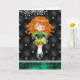 Esta exclusiva tarjeta de felicitación de cumpleaños de Irish Dance cuenta con un fondo súper ciego con un diseño diamante de imitación y secuencial. La bailarina irlandesa de cabello rojo se levanta en los dedos de los pies con zapatos blandos en un vestido individual verde y naranja y peluca de bonito. El interior presenta el saludo de cumpleaños "Te deseo un cumpleaños muy feliz y un año divertido para seguir..." Algunos gráficos de MUJKA.