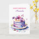 Una tarjeta de cumpleaños dulce para un amigo o miembro de la familia a la que puedes añadir un nombre, con un pastel de cumpleaños de bonito cubierto de flores moradas y rosas. En el interior hay una página de color con un pastel de cumpleaños.