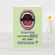 El verso de la parte delantera de la tarjeta con un ilustracion de boca abierta es "¿Esperando algo grande para tu cumpleaños?" El verso interior es "No comas todo el pastel de una vez. FELIZ CUMPLEAÑOS".