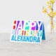 Esta tarjeta de cumpleaños presenta un fondo blanco con un texto geométrico colorido de "Feliz Cumpleaños" en varios colores brillantes y llamativos. El nombre personalizado de su elección se muestra en azul bajo "Feliz cumpleaños". En su interior encontrará un fondo azul bonito y un texto en blanco que dice: "Enviar desea su camino para un día brillante y feliz". Haga clic en "Personalizar esta plantilla" para cambiar fácilmente el nombre de ejemplo y el texto interior.