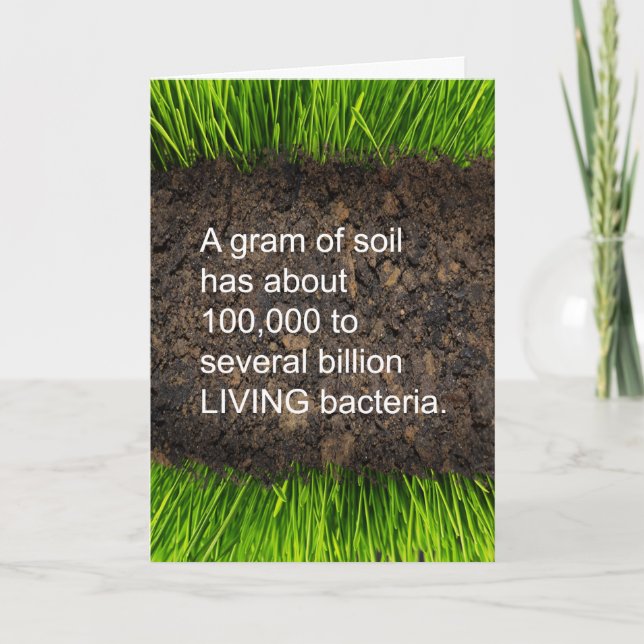 Graciosa tarjeta de felicitación de cumpleaños con que eres tan viejo como el tema sucio. Fotografía de la cubierta de tierra, suelo y hierba con "Un gramo de tierra tiene entre 100.000 y varios miles de millones de bacterias VIVAS". Personalizar o cambia el mensaje dentro como desee antes de la desprotección. Arte, imagen y verso copyright © Shoaff Ballanger Studios, 2022.
