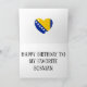 El hermoso diseño incluye globos felices y cintas de ticker con las palabras "Feliz cumpleaños", todo en los colores de la bandera de Bosnia. El diseño está terminado con el corazón en los colores de la bandera de Bosnia y el mensaje de cumpleaños. Los elementos son completamente personalizable usando la función "Personalizar". Esta colorida tarjeta de cumpleaños es el regalo perfecto para tu amigo de Bosnia.