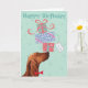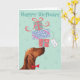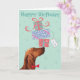Felices saludos de cumpleaños con este lindo diseño que presenta a un tierno Setter irlandés equilibrando un montón de regalos de cumpleaños en su nariz. El texto se puede cambiar fácilmente; sólo tiene que hacer clic en el botón personalizar.