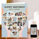 Cumpleaños feliz con un collage de fotos de corazón de amor, tarjeta de cumpleaños personalizada con formas abstractas groovys y tipografía retro. La plantilla de fotos está configurada para que agregue sus imágenes, trabajando en filas de arriba a abajo. El collage de fotos contiene 18 fotos que se muestran en una mezcla de retratos, paisajes y formatos cuadrados/instagram. Feliz cumpleaños, el nombre o relación y la redacción en el interior son totalmente editables para que puedas personalizar para cualquier ocasión. Una encantadora tarjeta keepsake que puedes enmarcar o poner en una caja de memoria para atesorar para siempre.