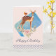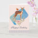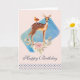 Una tarjeta de felicitación de cumpleaños con un bonito ciervo marrón con lomo blanco moteado. Un pajarito sentado en la espalda del ciervo. Un ramo floral elegante con rosas de acuarela y hojas verde oliva claro bajo los pies del ciervo. Un rectángulo de acuarela azul detrás de la imagen. Un borde de lunares a lo largo de la parte inferior. Diseño inocente y dulce con elegancia rústica. Fondo color melocotón. Tu mensaje personalizado en el interior.