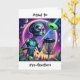 Tarjeta de cumpleaños con un tema de disco gofl y alien. Un extraterrestre que está en un planeta jugando al golf en disco. Campo de golf en disco dentro.