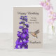 "Hummingbird Happy Birthday Sister-in-Law, Stephanie" de Catherine Sherman. Un colibrí sorbiendo néctar de un delfino morado crea un hermoso saludo para un cumpleaños. Puedes personalizar esta tarjeta con cualquier nombre y ocasión.