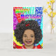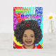 Tarjeta de cumpleaños para una niña pequeña. Pequeña adorable chica de color afroamericano con adorables rizos con una enorme sonrisa en su cara. Arte digital de estilo pop, tarjeta en blanco rojo, azul, verde azulado, color púrpura.