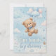 Welcome the new arrival with this incredibly cute and whimsical baby shower invitation! Featuring an adorable teddy bear floating on a cloud with pastel blue accents, this flat card invitation is perfect for a boy's baby shower or a gender-neutral celebration.