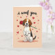 This pun greeting card shows a sweet beagle standing up on its back legs, facing you like it’s ready to give a gift. The dog has a tri-color coat with warm brown, white, and black patches, and it holds a single red rose with a green stem gently in its mouth. Its big blue eyes look kind and sincere, and a little pink tongue peeks out, adding to the friendly expression. Above the dog, the text says “i woof you” in black script lettering, placed near the top of the card. The background is a soft peach color with small red hearts scattered around, setting a romantic tone. A faint shadow under the beagle helps it feel grounded on the page, while the rest of the design stays simple and clear. It’s a cute way to say you care, whether it’s for a partner, friend, or someone who loves dogs ❤️
