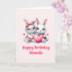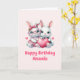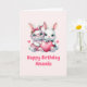 Birthday card with an illustration featuring 2 white furry bunnies sharing a big PINK heart. The girl bunny is wearing a cute bow on her head and heart-shaped glasses. The boy bunny is wearing an adorable little suit with a tie.