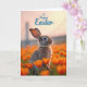 This card shows a small bunny 🐰 with soft gray-brown fur sitting slightly off-center in a field of orange blossoms, as if pausing to admire someone just out of view. Its head tilts up and to the right, and the glossy dark eye catches the light in a way that feels like a tender, attentive glance. Fine whiskers spread from a rosy nose, and the upright ears show a gentle pink inside that warms the face. The flowers around it blur into layers of deep tangerine and soft apricot, making the bunny feel close, like a quiet companion in the foreground. Across the top, a seasonal greeting is placed in flowing blue lettering, floating against a sky that fades from pale peach into a soft blue. The background stays dreamy and out of focus, with a faint, distant building shape on the horizon that adds depth without stealing attention. 🌷 The scene is framed by sunlit petals that melt into a soft haze, with the blue text hovering above the bunny’s raised gaze.
