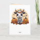 Imagina una carta de bienvenida muy adorable con un pequeño esqueleto de vaca frente y centro. Esta vaca no es para nada espeluznante, en cambio, ¡es como un lindo fiesta de disfraces de Halloween! Tiene un cuerpo óseo, pero está vestido con un traje de vaca, con manchas blancas y negras en su marco esquelético. Sus ojivas oculares son como dos puntos oscuros amigables, y tiene la sonrisa más dulce en la cara mientras sostiene una pequeña calabaza en una pezuña hueca. El fondo es festivo, con hojas y calabazas coloridas, lo que lo convierte en una escena adorable y linda que te da una gran sonrisa en la cara.