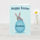 This card features a sweet gray bunny with soft pink inner ears, shiny dark eyes, a tiny pink nose, and a gentle blush, giving it a tender, friendly look 🐰. The bunny sits atop a large oval egg in a calm robin’s-egg blue, as if posing for someone it cares about. Soft shading along the egg adds depth, and a small fluffy white tail peeks out behind the bunny for a cozy touch. The background is pale blue with scattered white circles and starburst-like shapes that feel like light confetti drifting around 🌷. Near the top, a rounded seasonal greeting appears in dark lettering, centered above the bunny and egg. On the blue egg, a smaller line of text is placed across the front in a darker contrasting color, like a name or short note meant for a close friend. The bunny’s ears tilt slightly outward, and the egg’s smooth gradient shifts from lighter blue at the top to deeper blue along the lower curve.