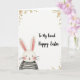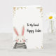 This card features a cute long-eared bunny 🐰 sitting near the lower-left corner, angled slightly inward as if leaning closer to the viewer with a friendly, affectionate gaze. The bunny is drawn with soft, simple lines, tiny dot eyes, a small pink nose, and lightly rosy cheeks that suggest a shy warmth. Its tall ears rise above its head with pale pink inner details, adding a gentle touch of color. A black-and-white striped shirt gives the character a neat contrast against the bright white background, like it dressed up just for a sweet spring hello. Around the edges, light watercolor-style florals and sprigs frame the scene, with pale pink blossoms and muted golden-green leaves that feel like a quiet bouquet 🌷. In the upper-right area, a flowing cursive-style message sits prominently in a soft gray tone, leaving plenty of open space around it. The overall layout feels airy and tender, with the bunny’s blush echoing the pink flowers in the corners. Pale pink blossoms and soft green leaves curl into the corners while the striped-shirt bunny remains anchored at the lower-left.
