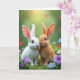 This card features two fluffy rabbits 🐰 at the center, one snowy white and the other a warm ginger tone, posed close enough that their noses nearly meet in a tender, friendly pause. Their large, dark eyes catch tiny highlights, and their relaxed posture suggests quiet affection without needing any extra drama. Behind them, a rich green garden setting glows with soft light filtering from above, giving the scene a gentle springtime hush. Faint red heart shapes hover in the background as blurred accents, adding a romantic touch while keeping the focus on the pair. Along the lower area, small flowers in lavender, white, and sky-blue dot the greenery like a natural frame, with a few petals seeming to point the eye back toward the rabbits 🌷. A short Easter greeting sits near the top in a light-colored font that stands out against the greenery, with a smaller line of text placed beneath it in a softer shade. Fine details show in the rabbits’ whiskers, the velvety texture of their fur, and the slightly translucent edges of their ears lit by the overhead glow. The foreground is layered with lush green leaves and scattered pastel blossoms around their paws, while the red hearts remain softly out of focus behind them.