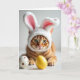 This card features a ginger-striped cat in soft, diffused light, gazing forward with wide green eyes that feel like a friendly hello. A fluffy white bunny-ear headband sits on its head, with pink lining inside the ears for a sweet spring touch 🐰. The background fades into a smooth, pale blur, keeping attention on the cat’s fur markings, whiskers, and the gentle curl of its paws. Near the bottom, a short Easter greeting is placed in small, light gray lettering, centered so it doesn’t distract from the portrait. A second line of text sits just beneath it in a muted pastel tone, spaced neatly and kept understated. In the foreground, two round egg-like shapes rest close together, suggesting a cozy, shared moment like friends leaning in for a photo 🌷. One sphere is creamy white with soft brown speckles, and the other is a warm yellow, both sitting on a lightly lit surface.