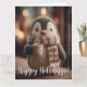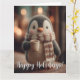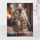 Tarjeta Cute Knitted Penguin Doll in Scarf Holding Mug