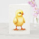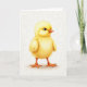 This card features a small yellow baby bird centered on a pale, lightly textured background, with tiny feather tips drawn one by one to look soft and downy. Its round head and glossy black eyes catch a pinpoint highlight, giving it a gentle, attentive gaze that feels like a quiet hello between close friends. A small orange beak and matching three-toed feet add a warm contrast, as if the little bird has just stepped forward to be near you. Soft, diffused lighting creates a faint shadow under its body, keeping the scene calm and grounded. Near the top, simple Easter text in a light gray tone sits neatly spaced above the illustration, leaving plenty of breathing room. A second line of smaller text appears near the bottom in the same soft color, balanced to frame the bird without crowding it, and a small 🌷 detail sits nearby. The background shows subtle diagonal lines running across the page behind the bird 🐰.