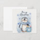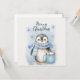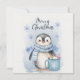 Una encantadora ilustración invernal de un adorable pequeño pingüino que lleva un sombrero y una bufanda a rayas azules, que aporta un ambiente acogedor y festivo. Los copos de nieve suaves y los tonos azules suaves en el fondo crean una atmósfera invernal mágica. ¡Perfecto para tarjetas de Navidad, carteles, pegatinas y manualidades de temporada!