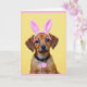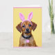 This card shows a young dog centered on a sunny pastel-yellow background, looking forward with big dark eyes that catch a tiny glint, like it’s sharing a gentle, friendly gaze. A pink headband sits between its ears, topped with tall plush bunny ears 🐰 that add a sweet seasonal touch. The dog’s short russet fur is softly detailed and stands out warmly against the smooth yellow field, giving the scene a cozy, affectionate feel. Around its neck is a slim black collar with a small round pink tag, like a simple little token from someone who cares. A thin pink border frames the picture and ties in with the headband for a tidy, coordinated look 🌷. Any greeting text is placed near the top in a soft pink color, leaving the dog’s face clear and inviting in the middle. The lighting is gentle and even, smoothing the shadows and making the eyes and fur look extra tender. The final detail is the narrow pink frame line running evenly along all four edges of the yellow background.