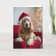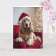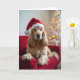 In this card, there's a cute dog with golden fur sitting on a cozy red chair, wearing a Santa hat with a white pom-pom. The dog looks calm but also like it's looking right at you, making you feel like you're part of its holiday world. The lighting in the picture is soft and gentle, highlighting the dog's eyes and fur, giving it a warm and festive feel. In the background, there are twinkling golden lights coming from a white Christmas tree, adding to the magical vibe of the scene. The dog is in the center, surrounded by holiday colors and symbols, like the rich red chair that matches its hat. Its posture seems thoughtful and excited for the holiday season, making you feel cozy and happy when you look at it. This card is perfect for spreading holiday cheer with its cute and heartwarming image 🎅🏼🎄🎁.