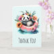 Gracias tarjeta con una adorable imagen de verano. Un diseño acuático con un panda blanco y negro sentado en una junta de natación en el agua. Rodeado de flores silvestres de bonito. Un oso totalmente frío.