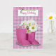 Ramo de margarita con botas rosas en gingham por cumpleaños