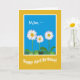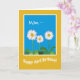 Una divertida tarjeta de cumpleaños de abril para "Mamá", con tres margaritas blancas en un fondo azul cielo. Parte de la colección "Daisy Chain" de Posh & Painterly.