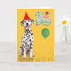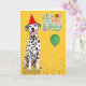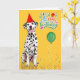 A cheerful birthday card for the Dal dog mom or dog dad with a bright yellow background sprinkled with confetti, a green balloon and a cute dotted red party hat on a happy Dalmatian.
