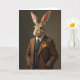 On the front of the card a well-dressed rabbit is shown from the waist up against a softly blurred, earthy backdrop, with warm brown fur, long whiskers, and deep dark eyes that seem to hold a tender, knowing gaze 🐇. He wears a three-piece outfit with a crisp white shirt, a dark tie with a faint texture, a fitted vest with small golden buttons, and a chocolate-brown jacket that sits neatly on his shoulders. His paws rest in the jacket pockets, giving him an easy, self-assured posture, like he’s waiting for a close friend to step in beside him. Tucked where a pocket accent would usually go are three tiny orange carrots with leafy green tops, adding a sweet, affectionate wink to the formal look 🌷. Soft side lighting brings out the texture of the fur and the gentle sheen of the fabric, keeping the mood quiet and intimate rather than stiff. The greeting text appears near the top in a simple, light-colored font that stands out softly against the muted background, with a smaller line of text placed near the bottom in a darker tone. The carrots sit upright at the jacket’s chest pocket, their bright orange color popping against the deep brown fabric.