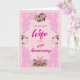 Una tarjeta de 49 años para tu esposa. Una elegante tracería en conjuntos rosados de las cuatro rosas rosas. El fondo es un estampado de flores rosa pálido. Una tarjeta encantadora para enviarle a su esposa en el aniversario de su boda.