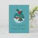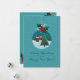 Tarjeta festiva de vacaciones en color turquesa que presenta un adorno de vidrio con un pueblo nevado y un árbol de Navidad, coronado con acebo y un lazo rojo. Fondo nevado y saludo con letra a mano. Personalice los nombres, año y mensaje interior, perfecto para familiares, amigos, maestros y compañeros de trabajo.
