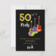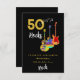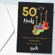 50 Rocks 50 cumpleaños fiesta de agradecimiento tarjeta con tres diseños de guitarra divertidos sobre fondo negro. Una guitarra eléctrica con patrón de llama de fuego y protector de escotilla roja, una guitarra multicolor semiacústica y un ilustracion de arte de guitarra acústica clásico psicodélico con tipografía fresca moderna en negro y oro personalizada. Esta plantilla fácil de usar para cambiar la edad y el nombre crea el fiesta perfecto gracias a favor de pegatina de bolsos para celebrar cincuenta al estilo rock and roll y es ideal para un guitarrista, músico y amante de la música. Cualquier guitarrista te dirá que nunca puedes tener demasiadas guitarras. Este moderno diseño musical de instrumentos musicales celebra la energía musical de este maravilloso instrumento musical y es la manera perfecta de rodar una celebración de 50 años. Pintura original de la artista Catherine Sweetman