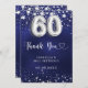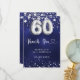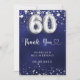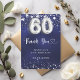 Una tarjeta de agradecimiento por su cumpleaños número 60. Un color de fondo azul marino. El color azul es desigual. Con estrellas falsas de plata. En la parte delantera: número 60 escrito con un tipo de letra en globo. Gracias, tu texto, título y una fecha. Atrás: Personaliza y agrega tu nota de agradecimiento y nombre.