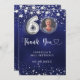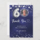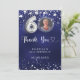 Una tarjeta de agradecimiento por su cumpleaños número 60. Un color de fondo azul marino. El color azul es desigual. Con estrellas falsas de plata. En la parte delantera: número 60 escrito con un tipo de letra en globo. Añadir una foto. Gracias, tu texto, título y una fecha. Atrás: Personaliza y agrega tu nota de agradecimiento y nombre.