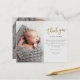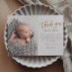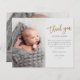 Esta nota moderna de agradecimiento a la foto incluye un guión dorado gracias, un mensaje personal y una foto vertical en el frente. La parte posterior incluye una segunda foto de bebé que es una foto horizontal de sangrado completo.