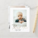 Tarjeta de agradecimiento para bebé con guión mínimo presupuestado. La parte de atrás incluye un mensaje de la familia y una segunda foto. Haga clic en el botón de edición para personalizar este diseño con sus fotos y detalles.