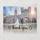 Boda de presupuesto moderno Gracias tarjeta con un diseño simple y lindo que incluye "gracias" en un guión grueso de escritura a mano, junto con dos corazones y tus nombres sobre tu foto vertical favorita. La parte posterior tiene una segunda imagen y tu mensaje personalizado en negro sobre fondo blanco.