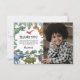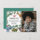 Tarjeta de agradecimiento Jurásico por su cumpleaños con un fondo negro liso, una foto dulce de su hijo, follaje verde de la jungla, una colección de dinosaurios acuarelas, y una plantilla de agradecimiento personalizada y moderna que es fácil de personalizar.