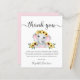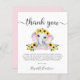 Cuidada tarjeta de agradecimiento para bebé con presupuesto reducido con "gracias" en un elegante guión gris suave con toques y una acuarela rosa de elefante bebé adornada con girasoles. Personalice fácilmente su mensaje de agradecimiento en una topografía gris simple o deje en blanco una nota manuscrita.