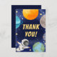 Para el pequeño que acaba de tener una fiesta de cumpleaños con temática espacial. Esta moderna tarjeta de agradecimiento de fiesta espacial infantil se puede personalizar con la inclusión de su propio mensaje en la parte posterior. En el frente, el texto del diseño se puede mantener tal cual o editarlo. Gracias a sus invitados por venir con estas adorables cartas de agradecimiento por su temática espacial.