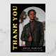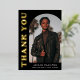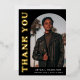 Elegante y de moda tarjeta de agradecimiento para graduación con la foto del graduado en la parte delantera con un marco de fotos en arco compensado. "Gracias" se muestra en letras retro de Relieve metalizado dorado sobre un fondo negro. Personalice la tarjeta de agradecimiento de la foto delantera del arco agregando el nombre del graduado, la escuela y el año de graduación. La tarjeta se invierte para mostrar el mensaje escrito a mano o con tipeo. La tarjeta de agradecimiento de graduación de Relieve metalizado negro y dorado es perfecta tanto para graduados de secundaria como universitarios.