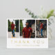 Tarjeta de agradecimiento plana de graduación de un tipo minimalista con múltiples fotos. La parte delantera tiene un collage de tres fotos con "Gracias" en letras grandes junto con el nombre del graduado en Relieve metalizado de oro real. El revés tiene tu mensaje personal. Esta moderna y sencilla tarjeta de agradecimiento es perfecta para un estudiante de secundaria.