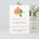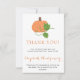 Tarjeta de agradecimiento a la mamá que se va a quedar con calabaza. Gracias por celebrar con nosotros la próxima llegada de la pequeña Elizabeth Montgomery. De acuerdo con el tema, la nota de agradecimiento presenta un adorable diseño de calabaza y la parte trasera lleva los colores de calabaza en un patrón rayado. Que sus asistentes sepan lo agradecidos que estuvieron por su presencia y cómo aprecian profundamente su reflexivo regalo. Que sepan que su amor y apoyo significa el mundo para ustedes.