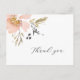 Nuestra carta de agradecimiento floral clásica incluye caligrafía fluida libre, flores rosas suaves, caqui y hojas verdes oscuras con ramas sobre un fondo blanco. La parte posterior está en blanco para escribir su propio mensaje con nombres en la parte inferior. Perfecto para bodas, duchas de novias y bebés. Para cambiar o quitar el color de fondo o el texto de la parte posterior, haga clic en el botón "Personalizar".