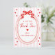 Send a heartfelt note of appreciation with this sweetheart baby shower thank you card featuring the phrase “A Little Thank You” in handwritten red script on the front. The design is framed with a hand-drawn scalloped oval topped with a red bow, set against soft pink and white stripes accented with scattered red hearts. Personalized text below to include your name for a coordinated, polished look. The back of the card provides space for your thank you message, making it easy to share your gratitude after the celebration. Designed to coordinate seamlessly with sweetheart-themed baby shower invitations and stationery, this thank you card is a thoughtful way to complete your baby shower suite.