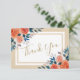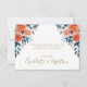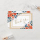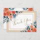 Elegante y moderna tarjeta de agradecimiento boda con un diseño de acuarela floral de rosas naranjas y follaje de tonificación azul sobre un fondo crema y blanco.