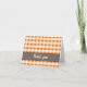 Tarjeta de agradecimiento inspirada en el sur del país diseñada con "gracias" en blanco sobre un ilustracion de textura de tela marrón, en un patrón de gingham naranja y blanco. El interior se personaliza con tu propio mensaje personalizado de agradecimiento. También puede borrar fácilmente el texto de la plantilla para dejar la(s) tarjeta(s) en blanco para escribir a mano sus propios sentimientos de gratitud. Estas tarjetas, con su patrón de gingham clásico, son perfectas para las celebraciones de Baby Shower. Correo coincidente (artículos comprados por separado):