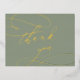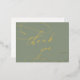 Esta romántica tarjeta de agradecimiento verde sabio y Relieve metalizado dorado es perfecta para un boda sencillo. El moderno diseño clásico presenta vistosos remolinos y florituras con una magnífica y elegante tipografía con letras a mano en lujoso Relieve metalizado dorado prensado. La parte posterior está en blanco para que puedas escribir a mano un mensaje personal. Estas tarjetas se pueden usar para un boda, una ducha de novia o cualquier evento especial.
